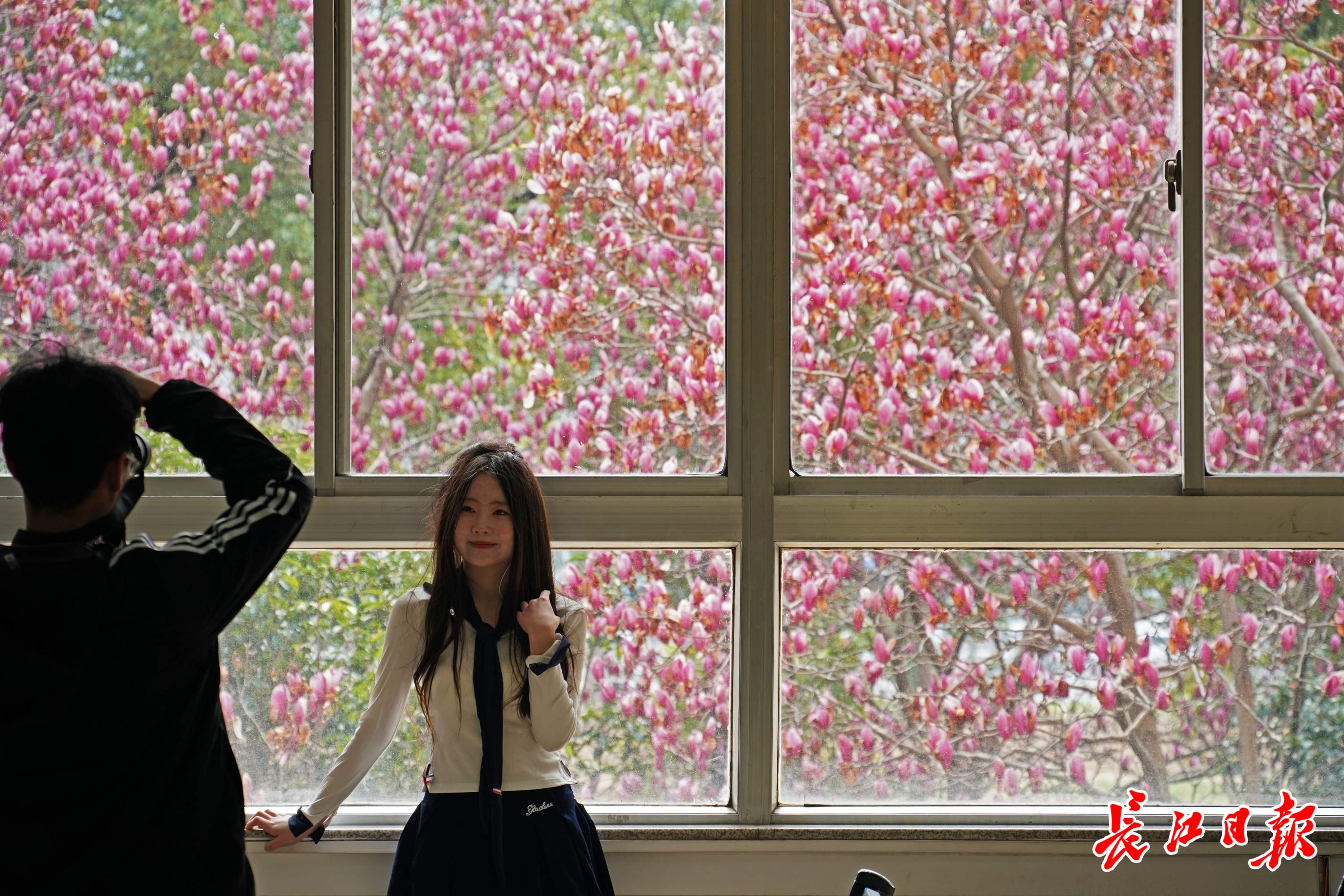 华中科技大学西十二教学楼外红色和白色的玉兰花争相盛开。从教室望去很是惊艳,大学生利用课间时间拍照留影。 记者詹松 摄