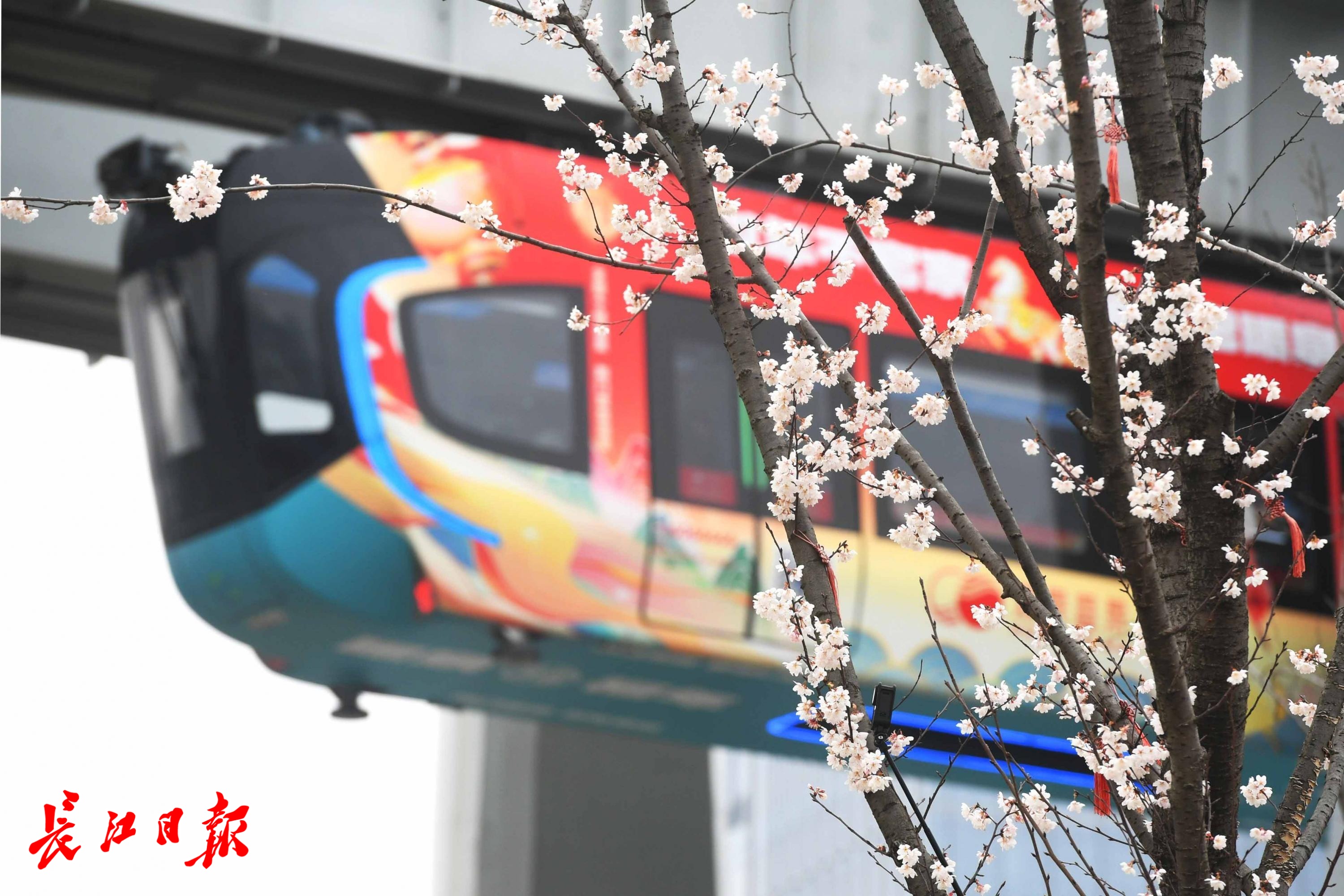 3月7日,光谷中央生态大走廊春意盎然,全新换装的一列空轨驶过,似乎也要和樱花争艳。 记者高勇 摄