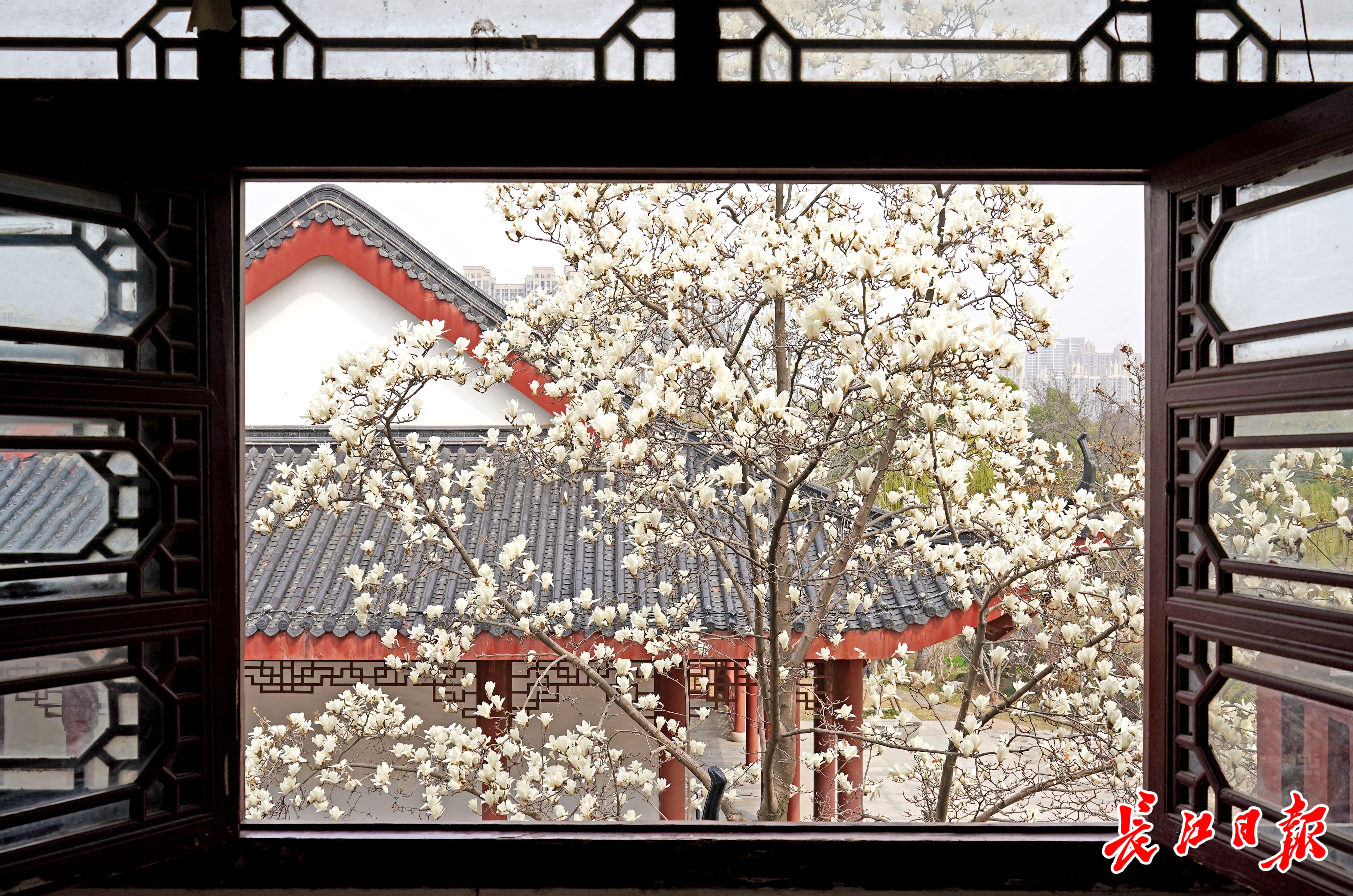 在堤角公园,白玉兰映衬着古建飞檐,一扇“玉兰花窗”让满树繁华定格成画,成为汉服爱好者争相打卡的风景。