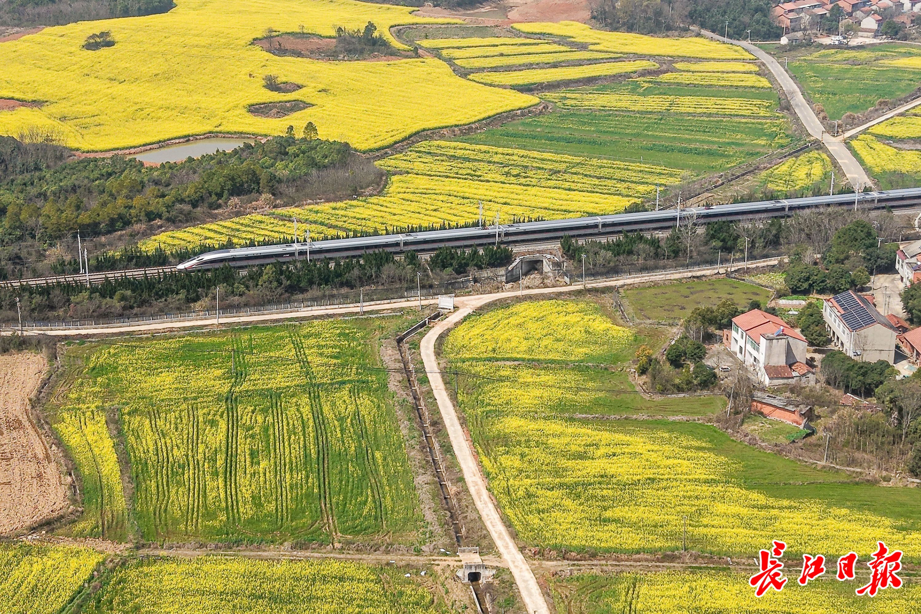 在江夏,高铁列车飞驰穿越金色花田。 记者胡冬冬 摄