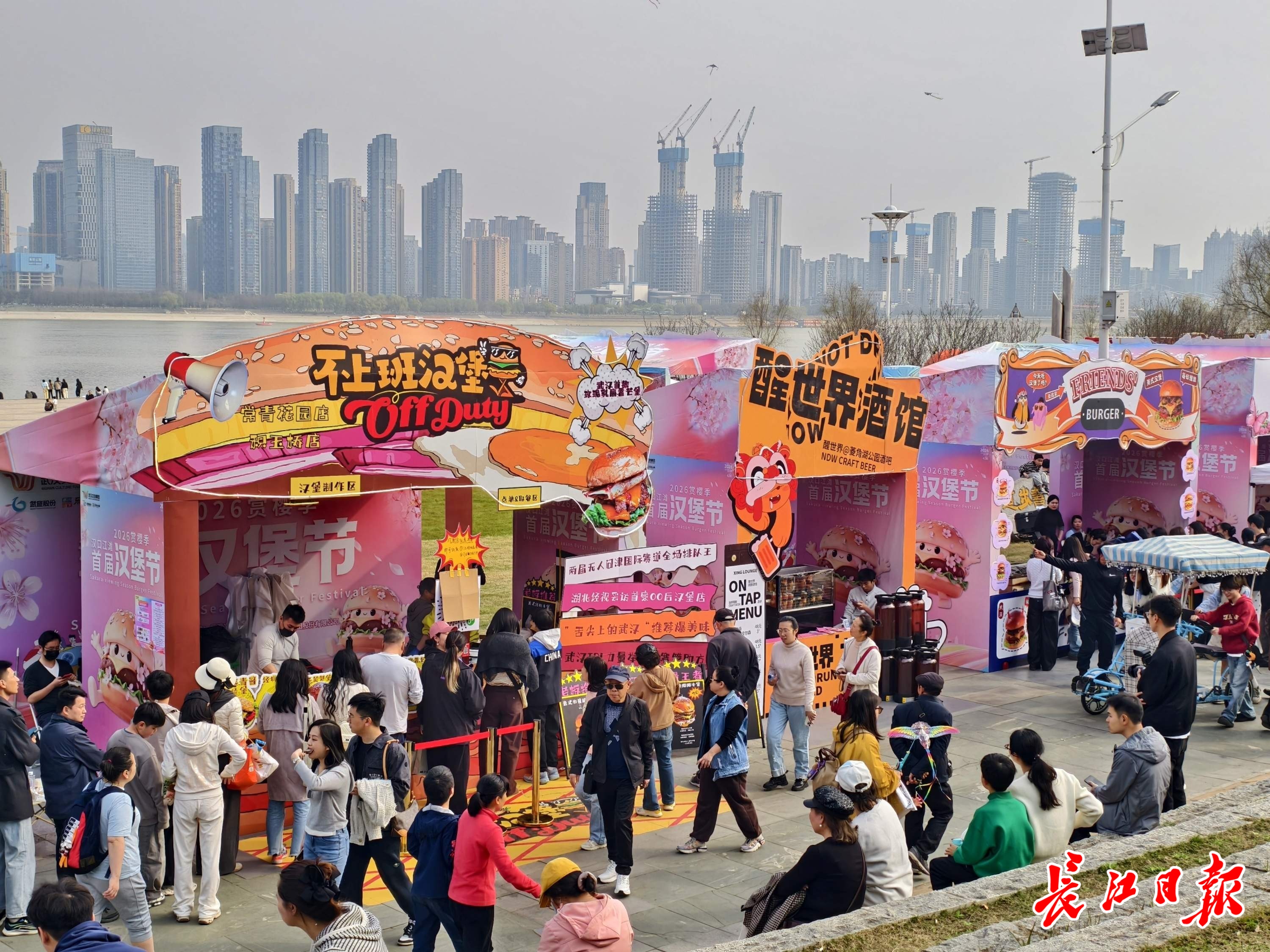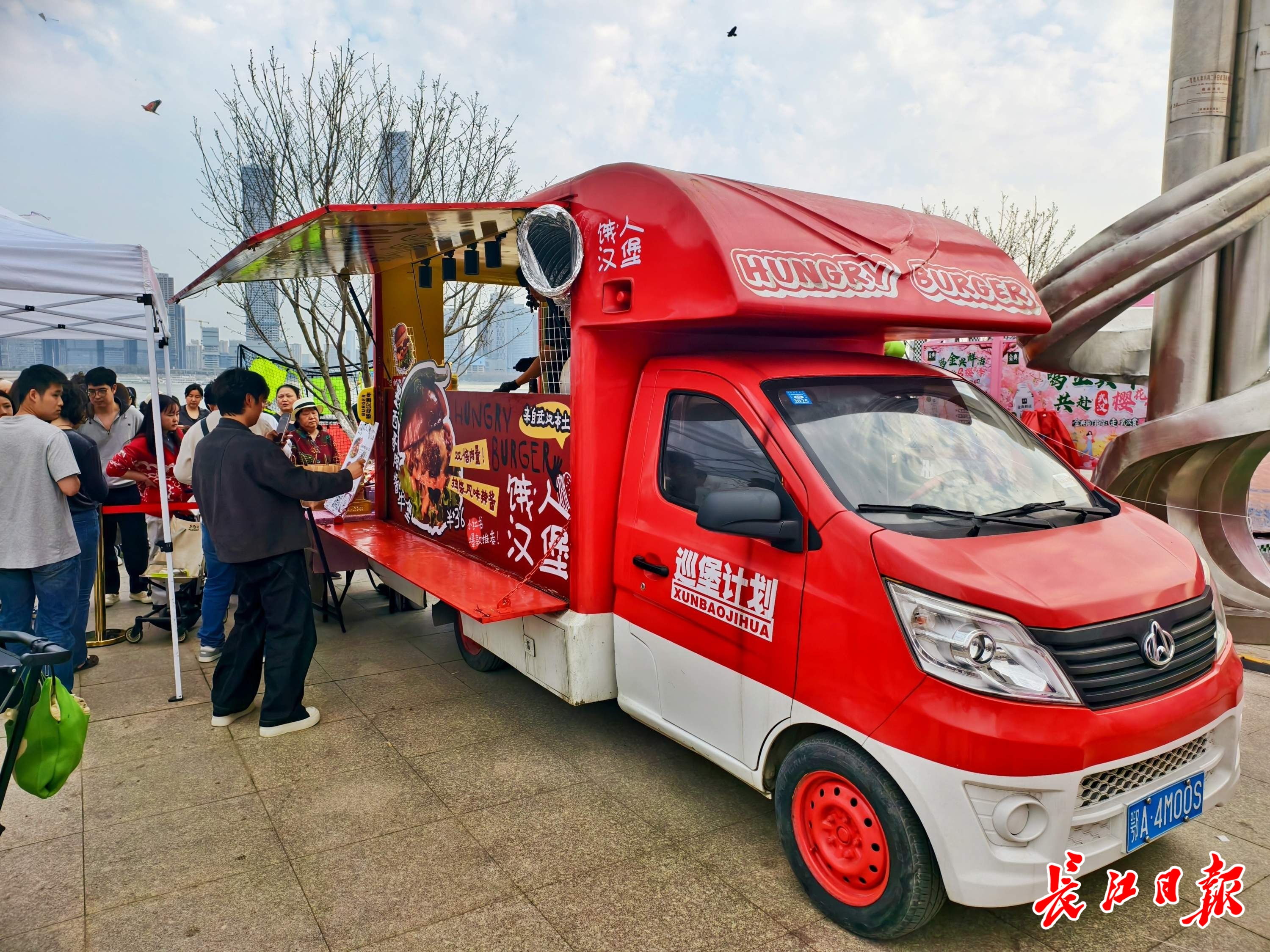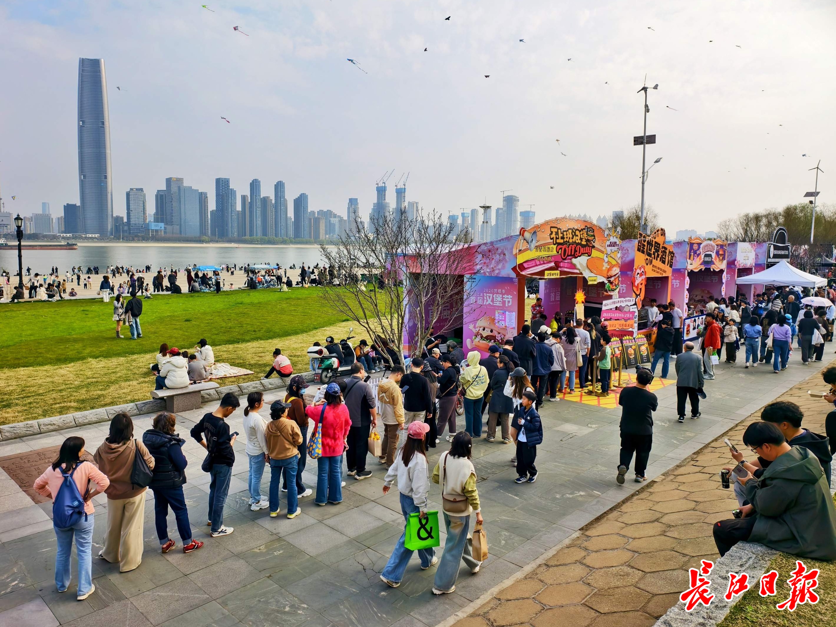 开摊不到一小时,19家本土汉堡品牌齐刷刷排起长队;樟树港辣椒鄂藕牛堡率先售罄,多家汉堡现场加急补货中……滋滋作响的铁板弥漫阵阵肉香,市民游客在江畔畅享美食、饱览春光。