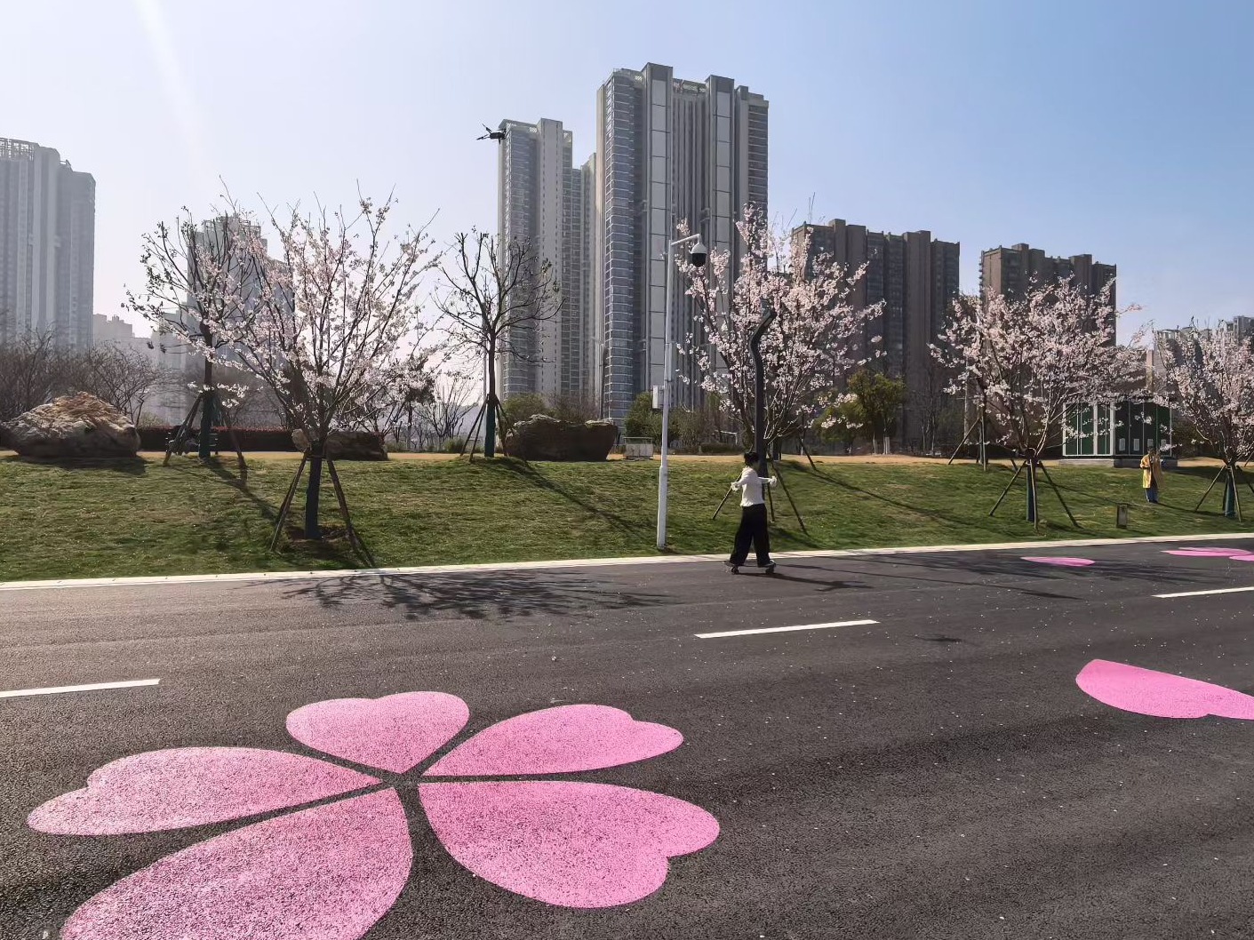 在建设三路闸口,春樱气息扑面而来,十来株樱花树开得正盛。走进终点区域,原本黑色的沥青赛道,化作一条长达760米的绝美“樱花跑道”。路面以艺术手法绘有78组灵动飘逸的樱花与花瓣图案,奔跑其上,如畅游花雨之中,这是今年汉马的独特设计。沿途,60余株真实的樱花树组成樱花长廊,部分已绚烂绽放,与远处工业遗存的大塔吊同框,形成刚柔并济的独特美感。“变化太大了,真漂亮!”3月13日上午,家住附近的万先生特意来“探班”,他举着手机拍个不停,“氛围十足!到时候选手跑过终点线,仪式感拉满!”在他的镜头下,有市民坐在大朵樱花图案上拍照,有市民正在樱花树下漫步。