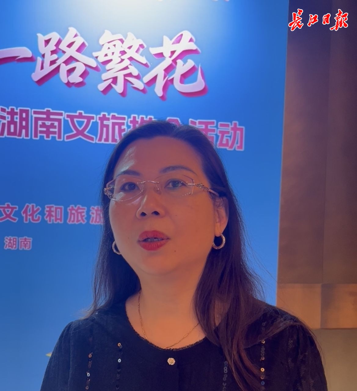 湖南省旅行社协会秘书长阳小容在推介会场外接受采访。记者万建辉 摄