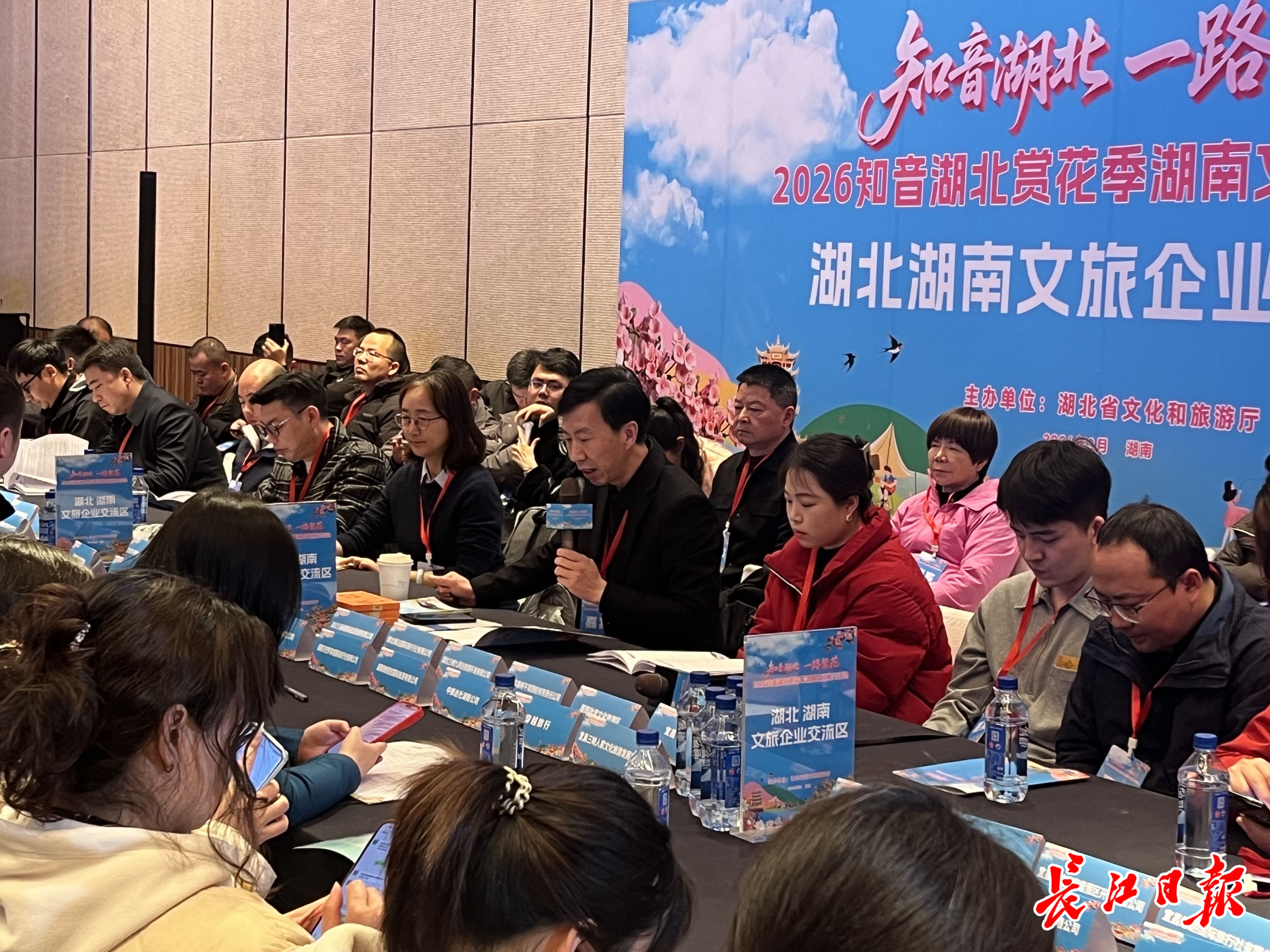 推介会前,湘鄂两省文旅企业围绕客源互送、线路共建开展专项交流洽谈。 记者万建辉 摄