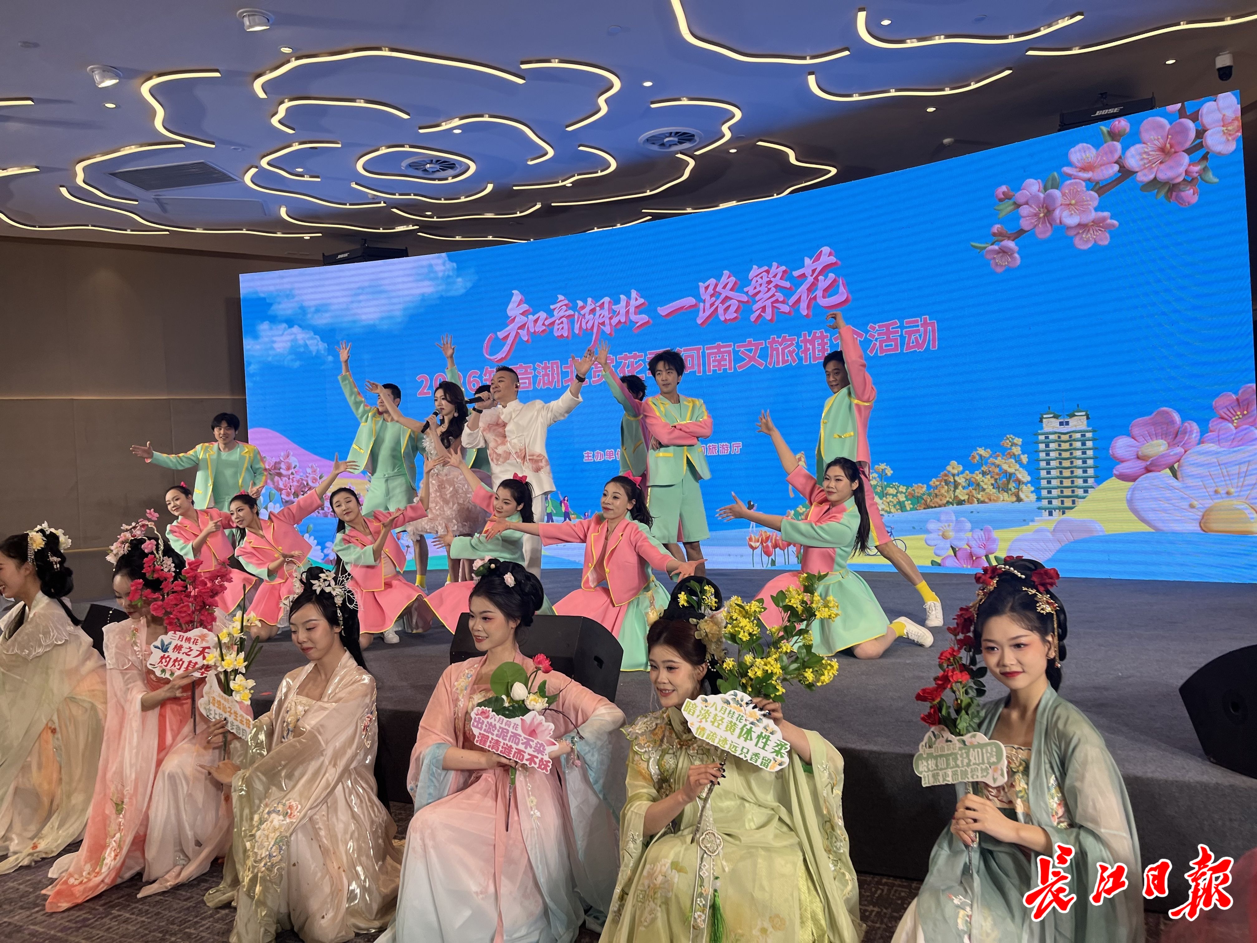 推介活动现场氛围热烈,荆楚特色展演点燃全场热情。“十二花神”惊艳亮相,身着传统服饰的花神们以灵动舞姿演绎春日花语,瞬间成为现场焦点;资深媒体人、中国摄影家协会会员雷刚以分享式推介《风雨七十载,一路竞繁花》,讲述他眼中湖北的春天;在小女孩清唱《春天在哪里》、地道武汉伢柳力文吉他弹唱《花心》后,现场还向河南观众赠送了湖北带来的百花种子;两地情谊戏曲表演《百花争春·戏韵天长》中,湖北的黄梅戏婉转悠扬,河南的豫剧铿锵大气,唱出豫鄂情深,将现场气氛推向高潮。