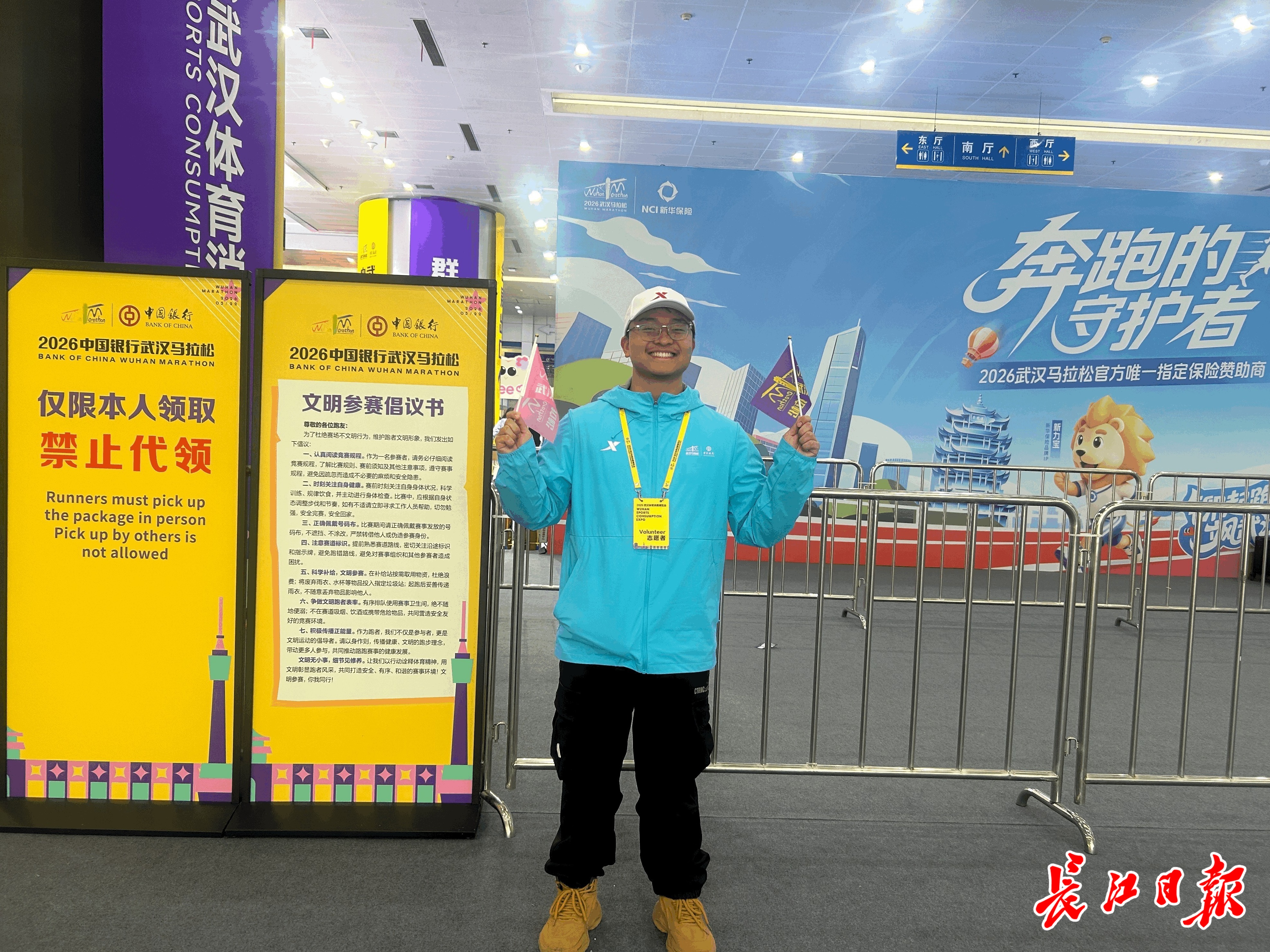 在他眼中,报到现场处处是温暖:选手们满怀期待、互相鼓劲,志愿者们分工明确、默契配合,明黄色的赛事展板与天蓝色的志愿服相映成趣,处处透着汉马特有的热烈与朝气。“能用自己的服务,帮选手顺利开启汉马之旅,就是我今天最大的收获。”徐泽德说,接下来几天他会继续坚守岗位,以最饱满的热情完成志愿服务,用青春守护这场属于武汉的奔跑盛宴。