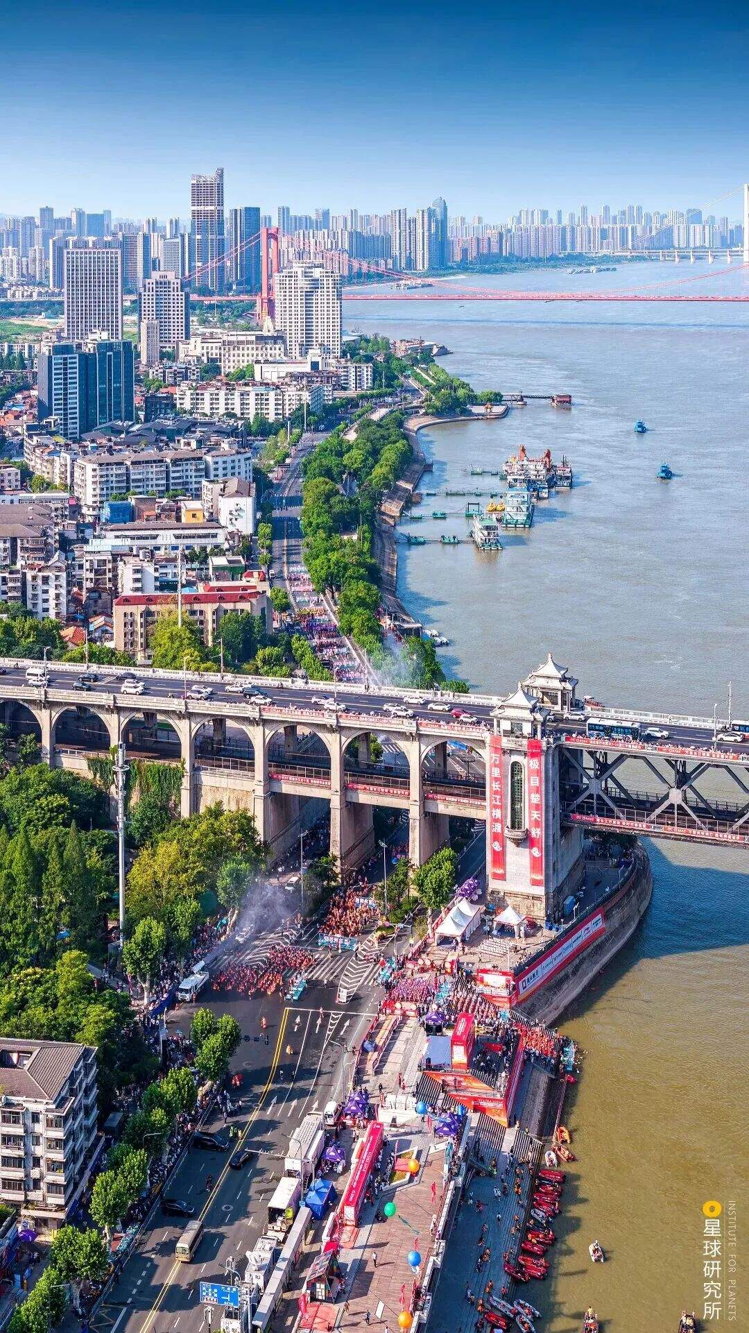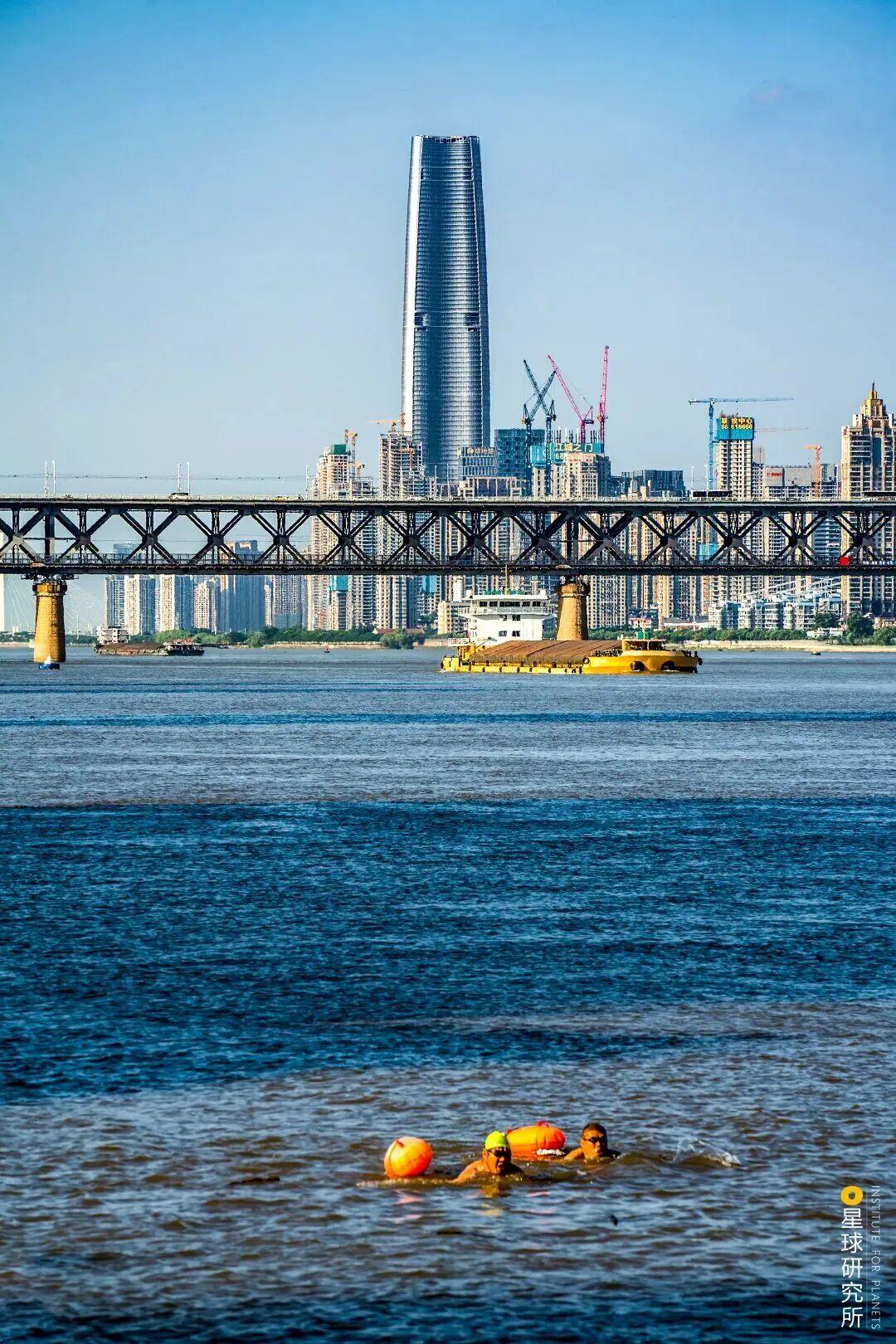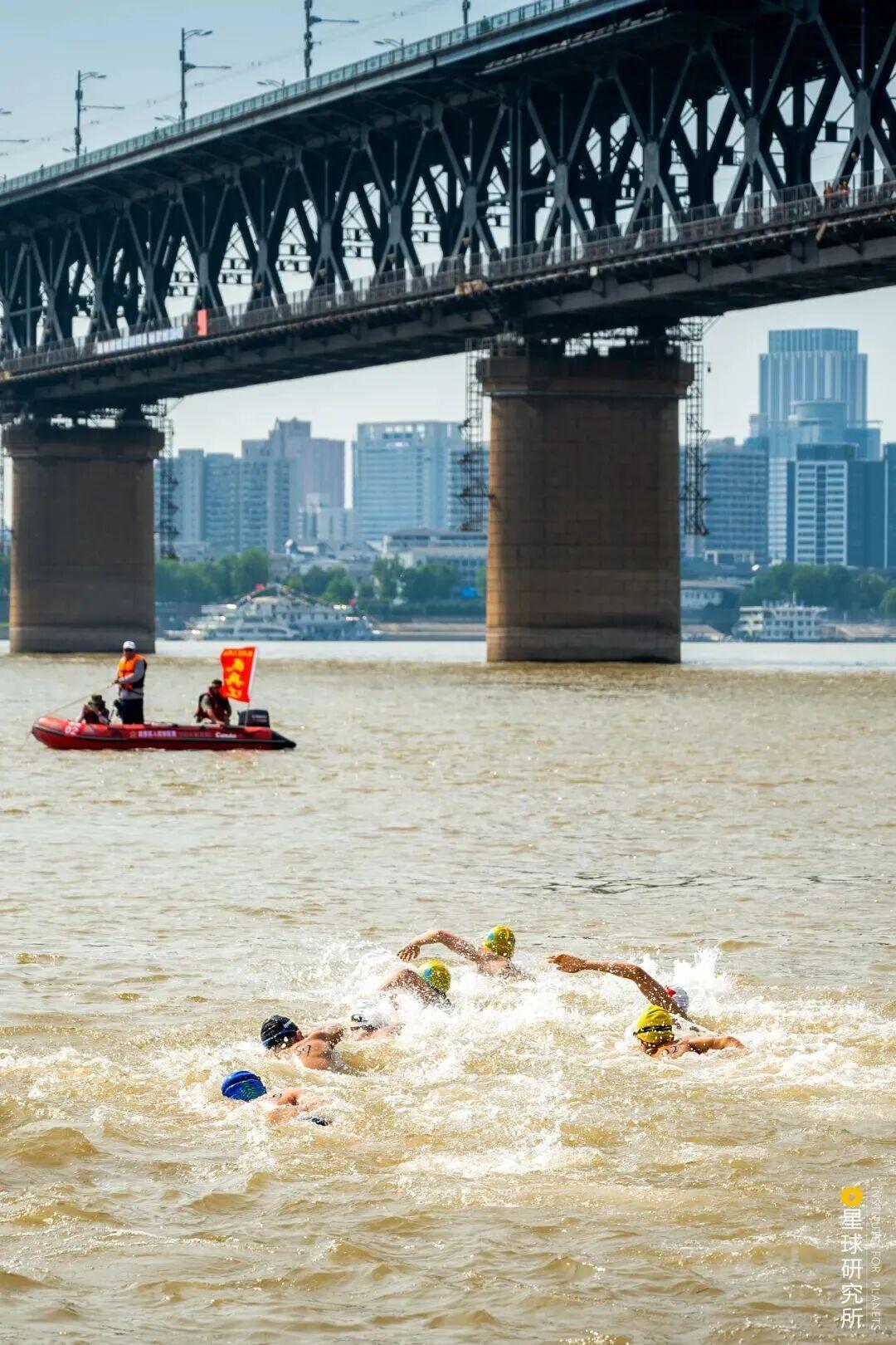 渡江节开场,长江大桥下渡江者正在激流勇进