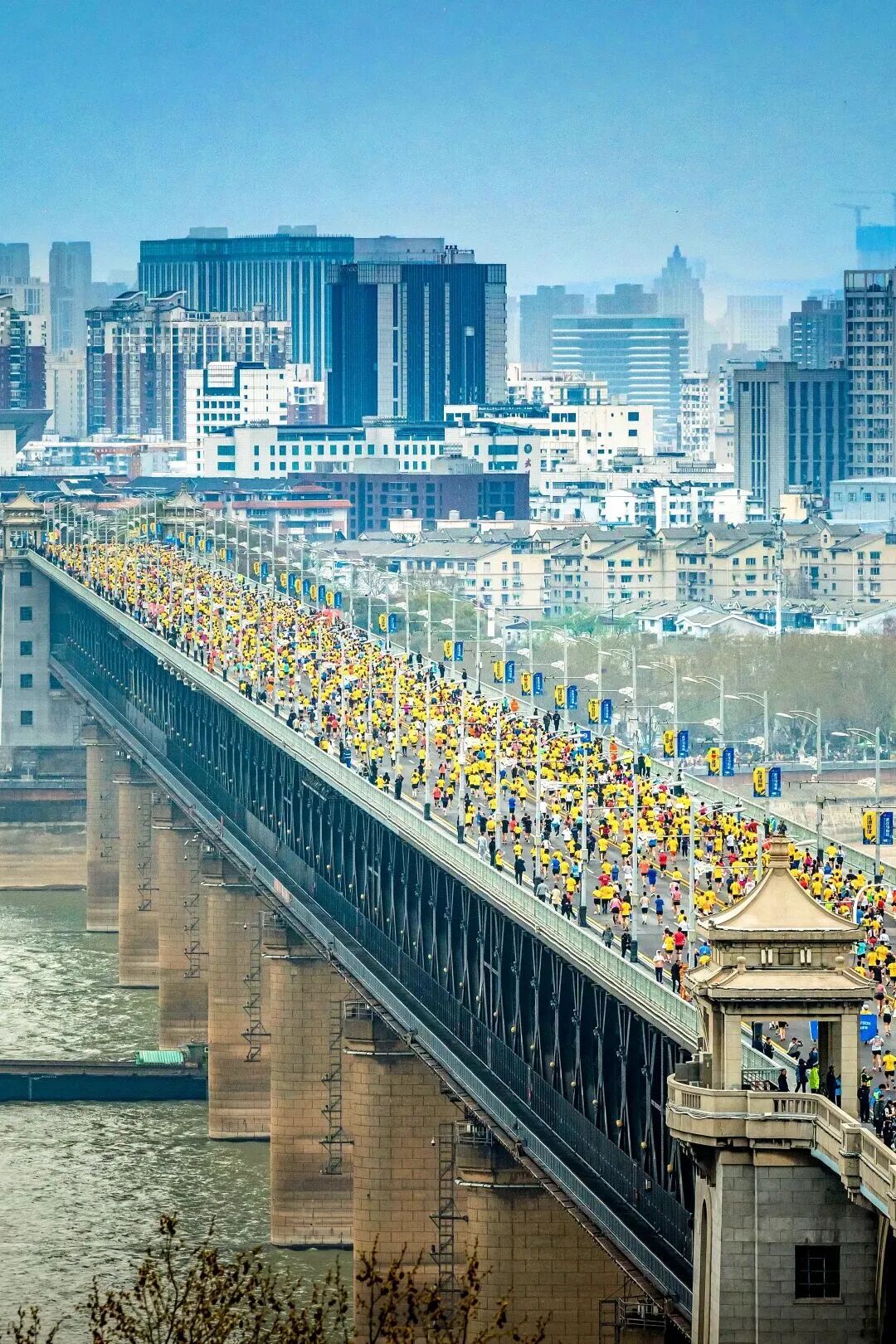 一年一度的武汉马拉松开跑,数万名跑者在武汉长江大桥上并肩奔跑