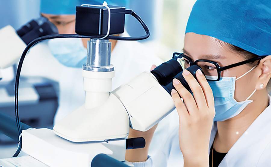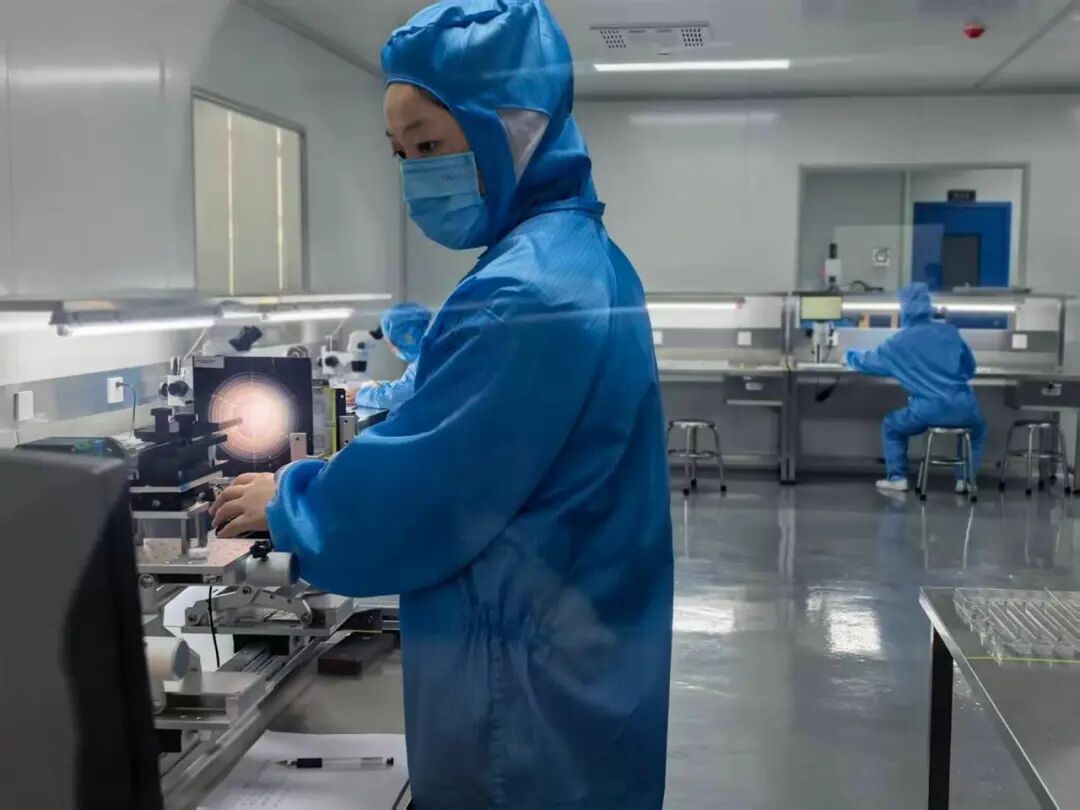 卓外(武汉)技术有限公司生产基地车间内,身穿无尘服的生产人员正在生产光学腹腔镜等产品。