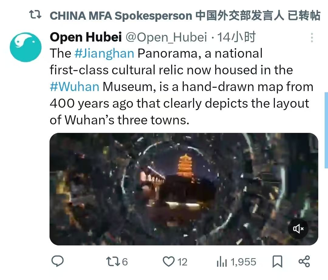 武汉《新江汉揽胜图》惊艳世界!在3月28日举行的2026年武汉文化旅游发展大会上,《新江汉揽胜图》AI宣传片发布,武汉以数智之笔、以AI之力,让这幅古画“活”起来、“动”起来。当天,中国外交部发言人官方账号在X、Facebook海外平台转发武汉最新AI大片《新江汉揽胜图》,引来全球网友围观。