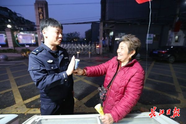 “是小鄂吧,快来吃冰激凌!我和你爸爸老鄂认识几十年,他是个好警察,你要像他那样啊。”2026年3月24日下午6时许,下班回家前,鄂靖顺路来到辖区武泰闸小学门前,查看治安情况。路边李金梅奶奶见到后,开心地拦住他,硬往他手中塞冰激凌。“是老鄂的儿子!唉,你爸爸走得好可惜。我们涂家沟人个个念他,想起来就掉眼泪!”一旁,美林超市的梅姨等老街坊见状纷纷上前打招呼。