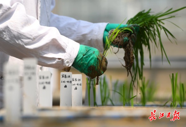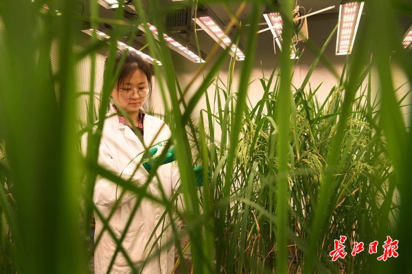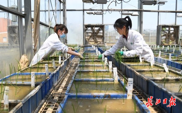 在湿热的人工气候室里,研究员潘丽观察完耐热实验中的水稻结实状况后,又奔赴科研大楼外的智能温室与科研小组同事忙着对水稻实验材料进行移栽。