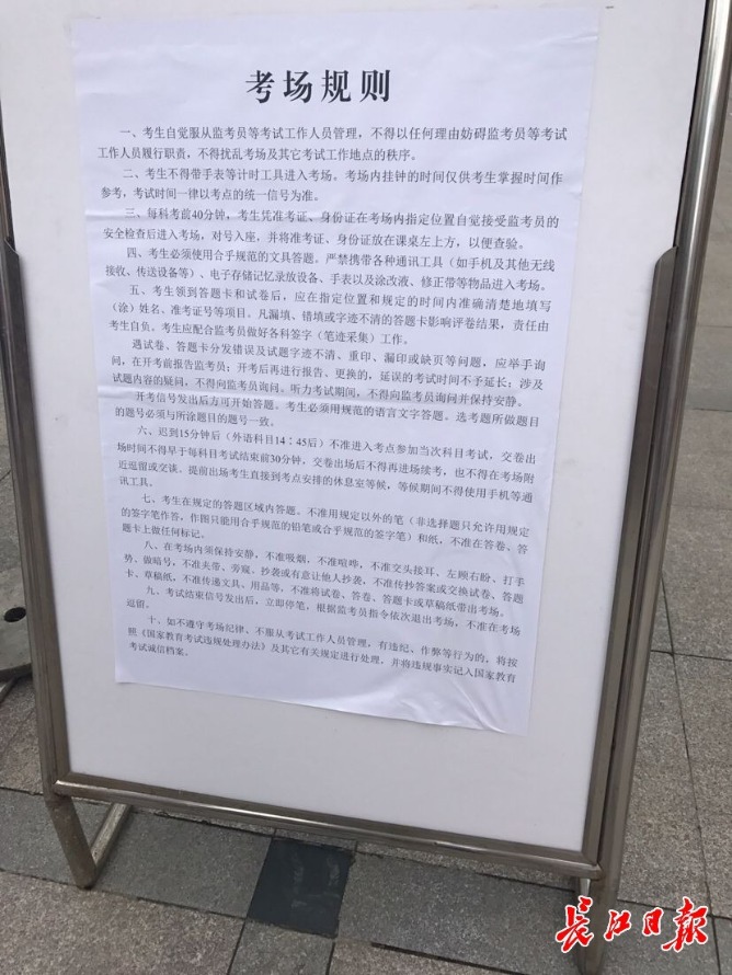 提醒各位考生:带好准考证、身份证和文具,8:20就可以进考场了。根据高考考场规则,迟到15分钟后不得进考场,交卷出场的时间不得早于每科考试结束前30分钟。