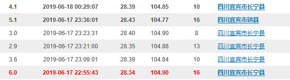 而后一个小时内,宜宾市又发生5次余震,其中4次在长宁县,一起位于宜宾市珙县。