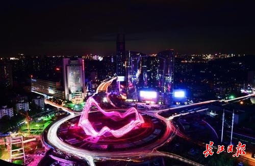 光谷广场综合体主题雕塑“星河”进行全面灯光调试。记者李永刚 摄
