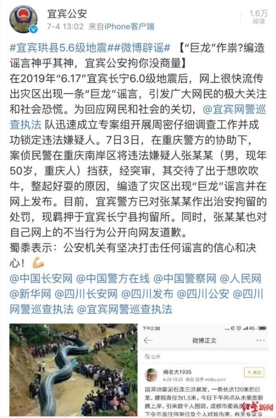 7月4日,红星新闻记者从四川宜宾警方获悉,在2019年“6.17”宜宾长宁6.0级地震后,网上很快流传出灾区出现一条“巨龙”谣言,引发广大网民的极大关注和社会恐慌。