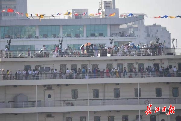 长江日报融媒体7月16日讯(记者钟磬如)16日上午,有数百位市民代表受邀登上“知音号”游轮观摩比赛。7时,船从知音号码头出发,开往长江大桥水域附近停泊,观众在四楼和五楼甲板观看个人抢渡赛。