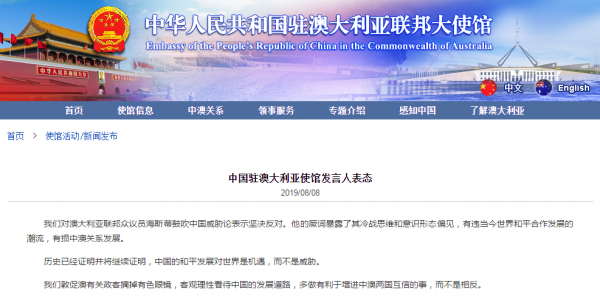 海外网8月8日电 据中国驻澳大利亚大使馆官方网站8月8日消息,针对澳大利亚议员近期鼓吹“中国威胁论”,中国驻澳使馆表态。全文如下: