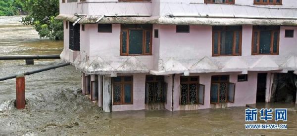8月18日,在印度北部喜马偕尔邦,建筑浸泡在洪水中。据印度媒体18日报道,印度北部喜马偕尔邦当天持续暴雨引发洪水、山体滑坡和泥石流等自然灾害,已造成至少18人死亡。