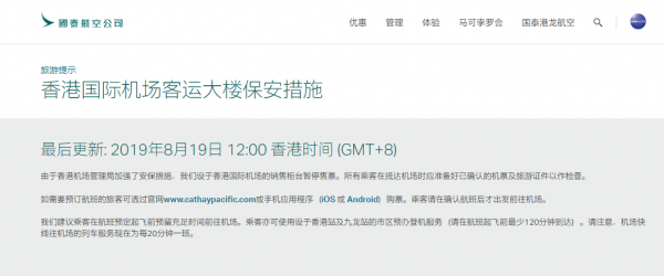 19日,国泰航空在其官网发布消息称暂停香港机场柜台售票。