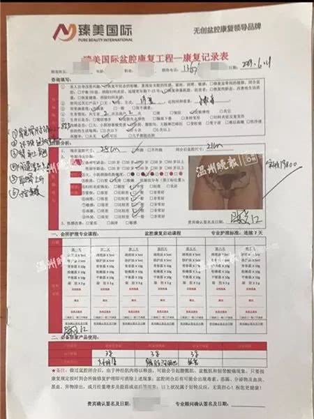 陈女士当初付费后签过一份《臻美国际盆腔康复工程—康复记录表》,上面记录了盆腔闭合前后的尺寸,还有一系列“疗效”,在备注栏写着:“做过盆腔闭合后,由于神经肌肉得以释放,可能会引起腰骶肌、盆骶肌和韧带酸痛现象。只要按康复规定按时到会所做修复护理,即可消除上述现象。”