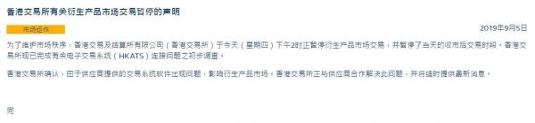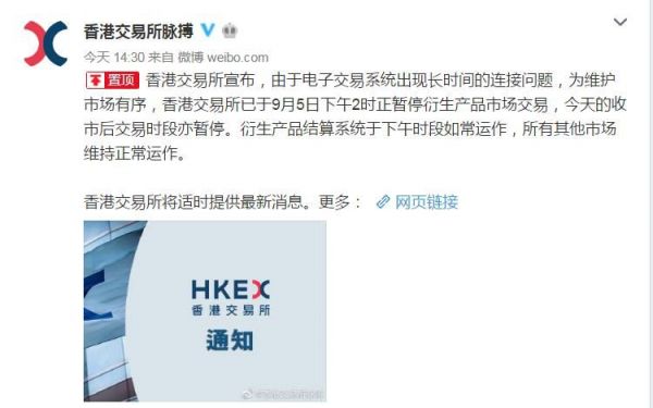 14时30分,港交所官方微博发布消息称,由于电子交易系统出现长时间的连接问题,为维护市场有序,香港交易所已于9月5日下午2时正暂停衍生产品市场交易,今天的收市后交易时段亦暂停。衍生产品结算系统于下午时段如常运作,所有其他市场维持正常运作。