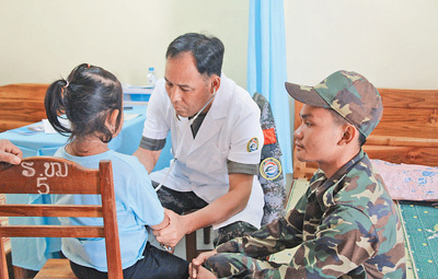 “和平列车”医疗队队员正在老挝巴色市为当地民众做身体检查。