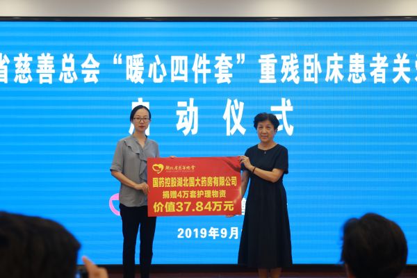 省慈善总会相关负责人介绍,“暖心四件套”包括一张护理床、一张沐浴床、一年量尿不湿、一年量医用床单,希望通过给困难对象赠送实用“暖心四件套”,提升他们的幸福感和安全感。当天,国药控股湖北国大药房有限公司捐赠价值37.84万元项目护理物资,九州通医药集团有限公司捐赠价值20万元项目护理物资。