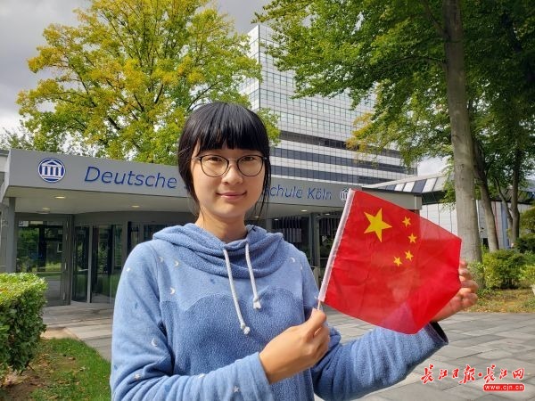 斗鱼主播张天惟在德国科隆体育大学与国旗合影