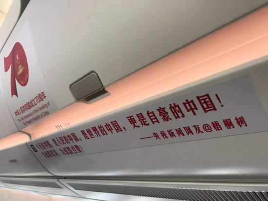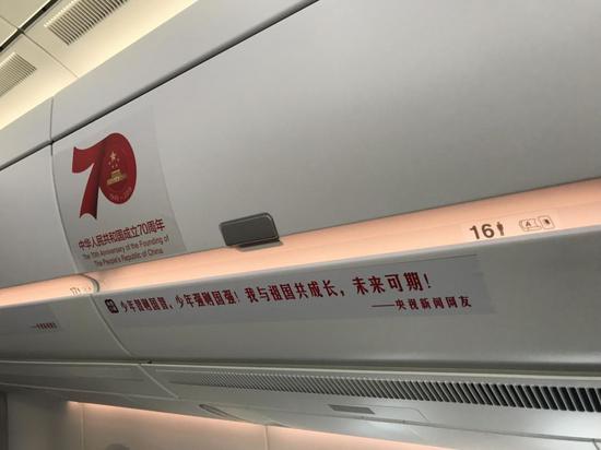 机舱壁上贴满了央视新闻网友对于祖国的祝福