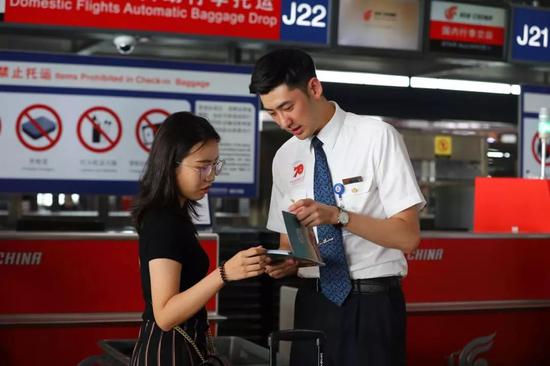 △国航地服工作人员帮助旅客扫码看直播