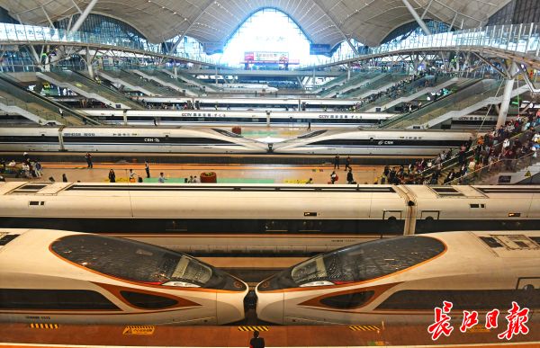 武汉站里列车到站和发车密度较大。