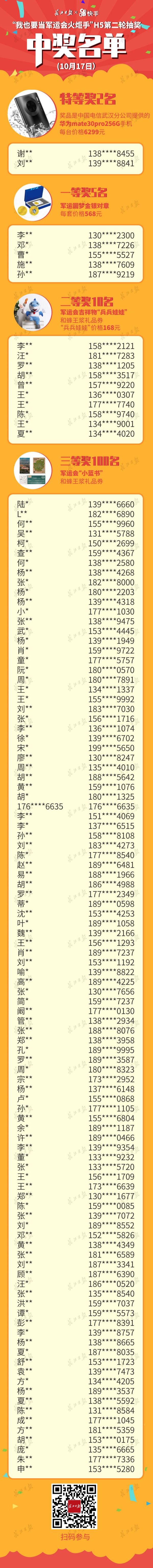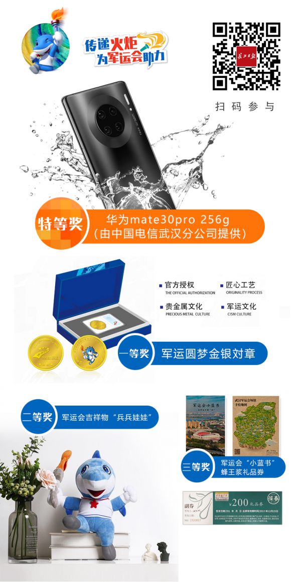 现场抽取特等奖2名,奖品为华为mate30pro256G手机,每台价格6299元;一等奖5名,奖品为军运圆梦金银对章,每套价格568元;二等奖10名,奖品为军运会吉祥物“兵兵娃娃”和蜂王浆礼品券,“兵兵娃娃”价格168元;三等奖100名,奖品为军运会“小蓝书”和蜂王浆礼品券。