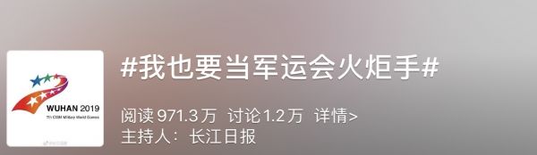 截至17日17:00,已有近60万网友参与线上火炬传递,长江日报主持的微博话题#我也要当军运会火炬手#已有近1000万阅读量。