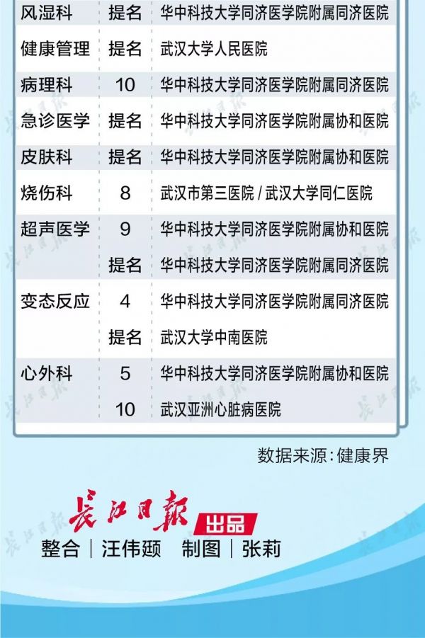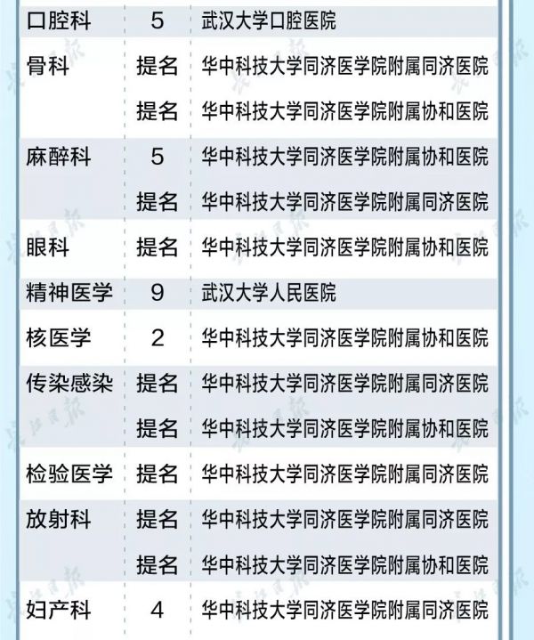 在40个专科排行榜中,武汉地区有多家医院进入榜单或获得提名。在多专科榜单中,华中科技大学同济医学院附属同济医院和协和医院双双上榜。值得注意的是,40个专科中,武汉地区均有医院入围。