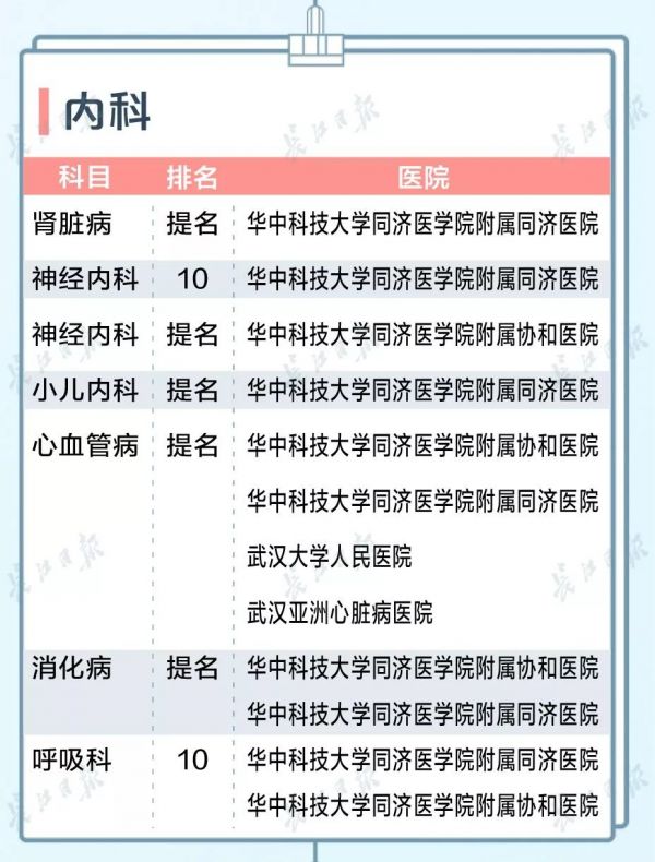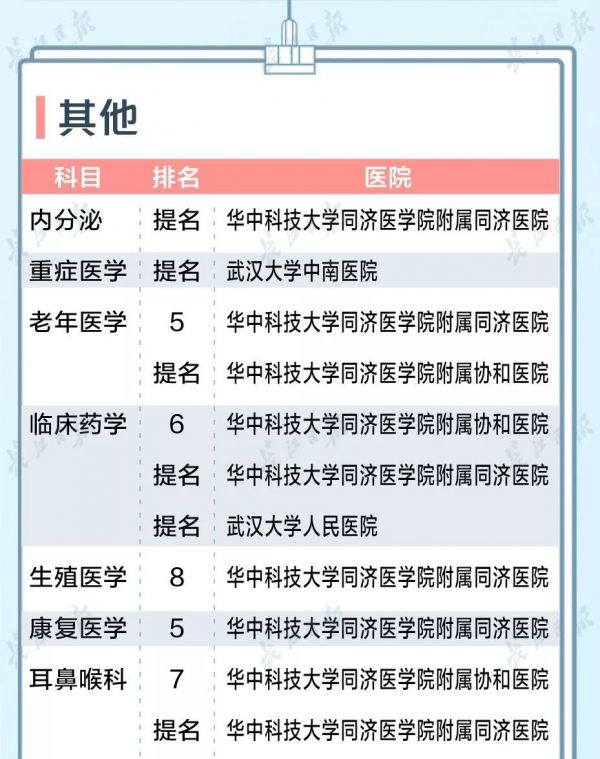 在医院排行综合榜100强中,武汉一共有5家医院上榜,华中科技大学同济医学院附属同济医院进入前10。