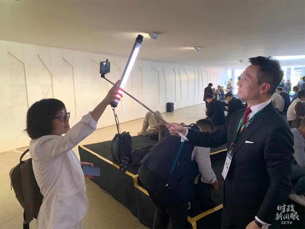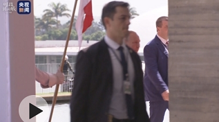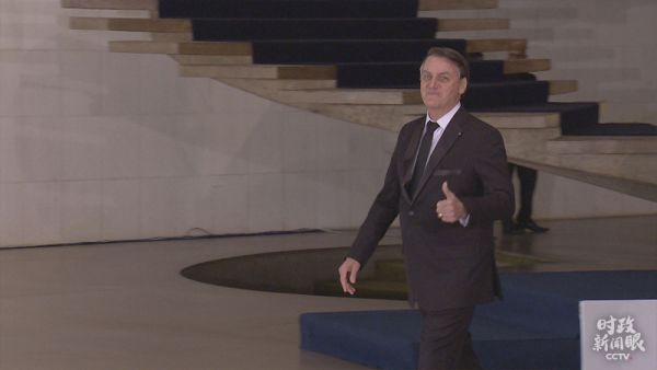 △13日上午,博索纳罗来到巴西外交部一层大厅迎接习主席时,向记者席竖起大拇指。习主席在会谈时对博索纳罗说:我们看好巴西发展前景,对中巴合作充满信心。(央视记者张晓鹏 摄)