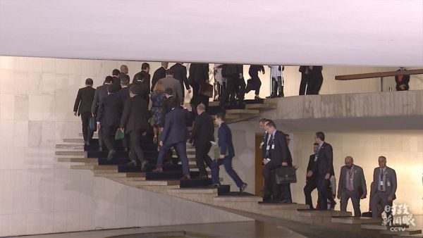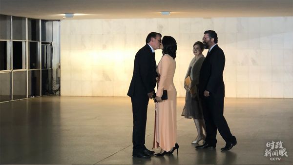 △当地时间13日晚,博索纳罗总统夫妇在外交部一层迎候各国元首夫妇时,上演“巴西式浪漫”。(央视记者马亚阳 摄)