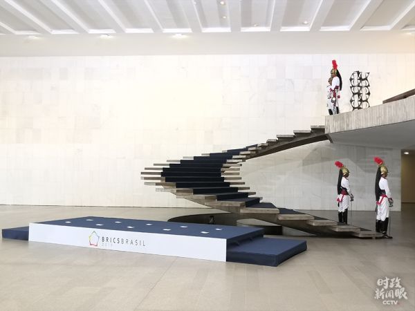 △14日上午,以这个楼梯为背景,五国领导人集体合影。(央视记者薛冠南 摄)