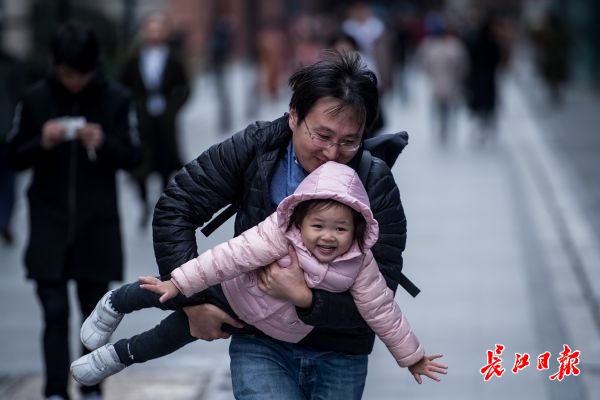 一对父女裹着棉袄在汉街玩耍 记者任勇 摄