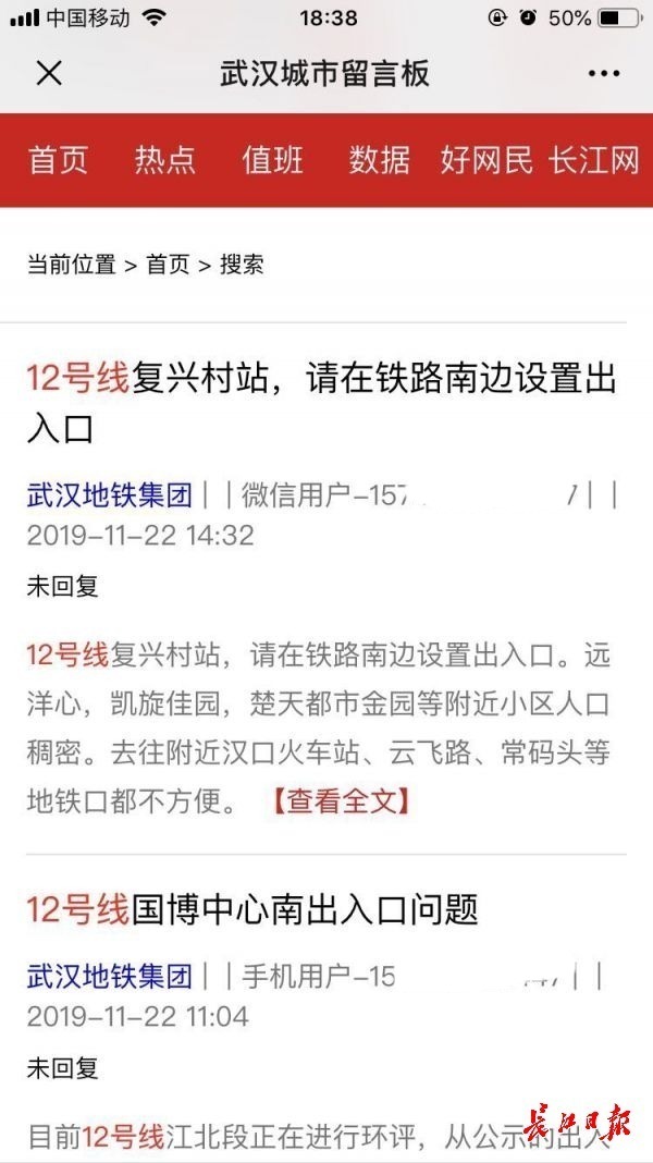 长江日报-长江网记者发现,除了地铁12号线,还有不少网友在市网群部·长江网武汉城市留言板咨询10号线、11号线、16号线、19号线等规划建设问题,相关部门均进行了答复。