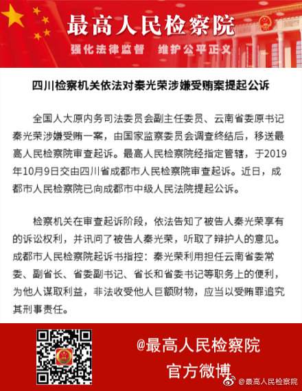 四川检察机关依法对秦光荣涉嫌受贿案提起公诉