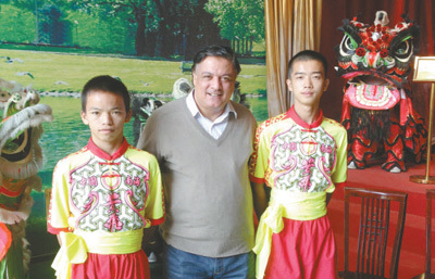 图为纳赛尔·阿卜杜·阿勒(中)与中国舞狮队少年合影。