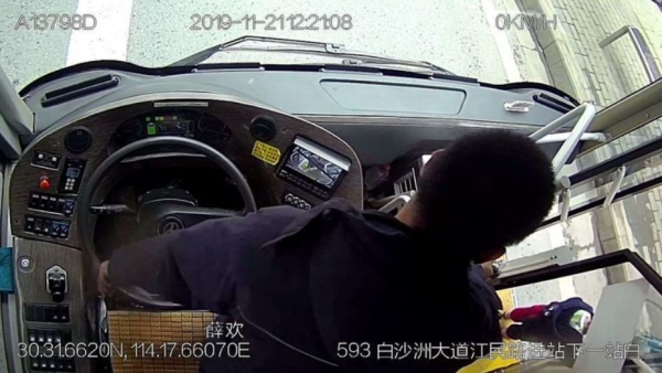 公交593路司机薛欢紧紧抱住小男孩将他送下了车(视频截图)