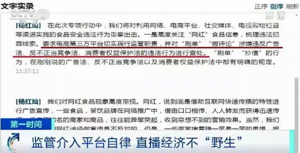 有关部门的监管正在逐步介入。 10月17日,最高人民检察院召开新闻发布会,要求电商第三方平台切实履行监管职责,并对“刷单”“假评论”等涉嫌违法行为进行查处。 而国家广播电视总局11月1日发布的有关通知要求,网络视听电子商务直播节目和广告节目不得夸大其辞,不得欺诈和误导消费者。