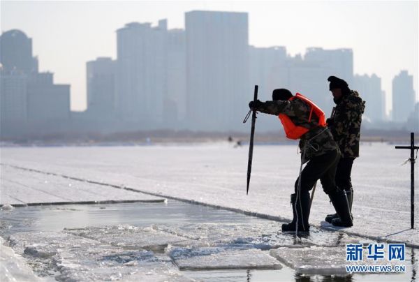 12月7日,采冰人在哈尔滨采冰节上捞冰。新华社记者 强勇 摄