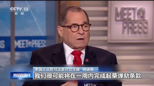 美国众议院司法委员会主席 纳德勒:接下来将有很多的磋商,委员会的委员之间、众议院领袖与议员之间,我们将做出决定,我们很可能将在一周内完成起草弹劾条款。