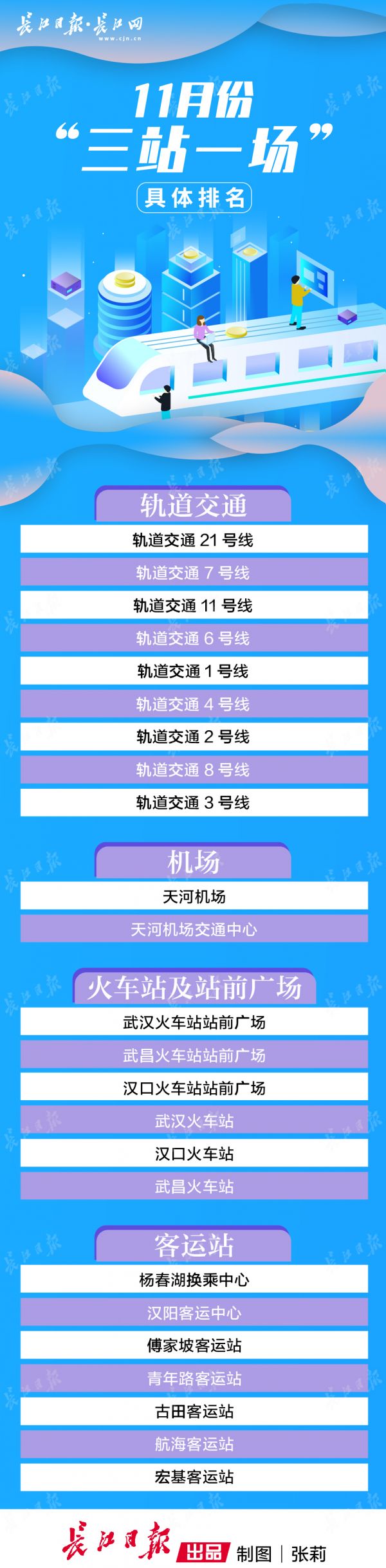 长江日报-长江网12月10日讯 12月10日,市文明办、市交通运输局公布了11月份“三站一场”文明程度指数测评排名。测评结果显示,各类场站综合排名第一的分别是轨道交通21号线、天河机场、武汉火车站站前广场、杨春湖换乘中心。