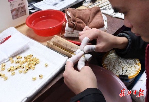 周大福珠宝文化产业园的工作人员对足金饰品进行人工抛光工艺 记者高勇 摄