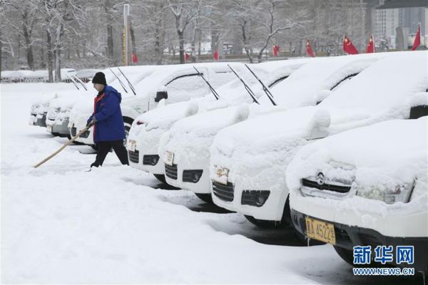 12月17日,在哈尔滨市区,一名市民在清雪。 当日,雪后的哈尔滨呈现出别样的景致。 新华社发